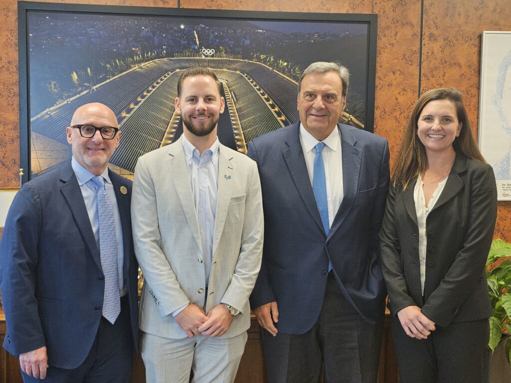 Επικεφαλής της αμερικανικής ομάδας στην επίσκεψη στην ΕΟΕ, ήταν ο διευθυντής Fred Maas, μαζί με την Kacey Knaupf Florence και τον Zac Emde, ενώ από την πρεσβεία των Ηνωμένων Πολιτειών στην Αθήνα, παραβρέθηκαν στη συνάντηση, ο Jay Raman, η Virginia Blakeman και η Eλένη Αλεξάκη. Στη συνάντηση παρέστη και ο Αρχηγός Αποστολής της Ελλάδας στους Ολυμπιακούς Αγώνες Los Angeles 2028, Πέτρος Συναδινός.