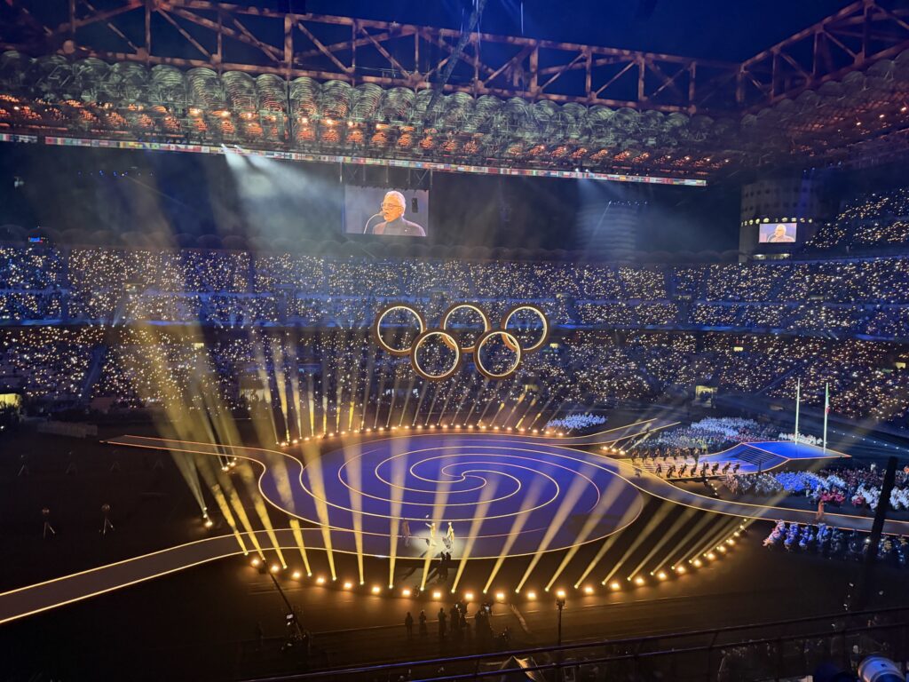 Ο Ιταλός Πρόεδρος Σέρτζιο Ματαρέλα κήρυξε επίσημα την έναρξη των Αγώνων στο κεντρικό γεγονός που πραγματοποιήθηκε στο στάδιο Σαν Σίρο του Μιλάνου, στο πλαίσιο μιας πρωτοφανούς διοργάνωσης που συνδέθηκε ταυτόχρονα με εκδηλώσεις στη συνδιοργανώτρια Κορτίνα ντ’Αμπέτσο, σε απόσταση άνω των 400 χιλιομέτρων.